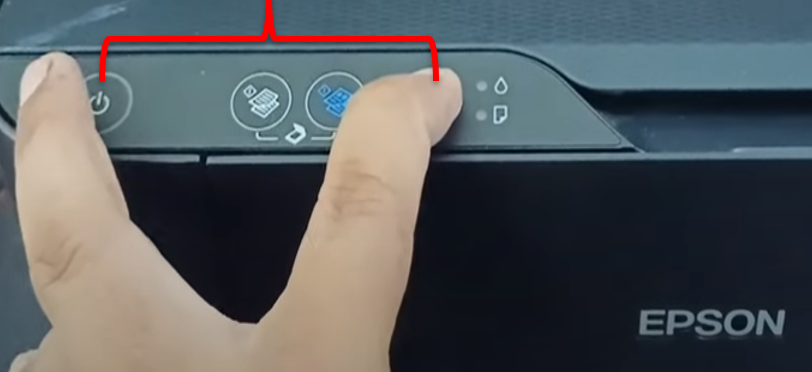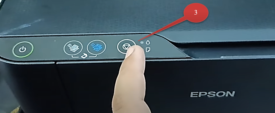 6. ຂັ້ນຕອນນີ້ເປັນການເຊັກຫົວພີມ ດ້ວຍການກົດປຸ່ມສາມລ້ຽມຄ້າງໄວ້ ແລ້ວຈີ່ງກົດ ປຸ່ມປິດ-ເປີດ ຂັ້ນຕອນນີ້ໃຫ້ໃສ່ເຈ້ຍປະໄວ້ຈຳນວນໜື່ງ
