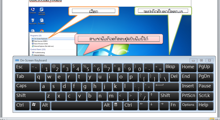 ໄປທີ່ປຸ່ມ Start ແລ້ວເສີດຫາຄໍາວ່າ On screen keyboard
