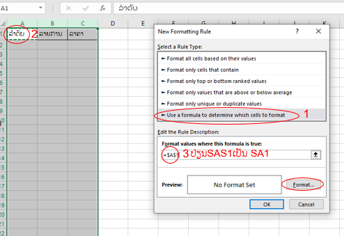 ເລືອກ Use a formula to determine which cells to fomat ເລືອກລຳດັບ ເບີ3 ປ່ຽນ SAS1 ມາເປັນ SA1 ແລ້ວກົດ Fomat