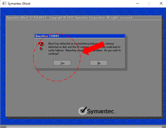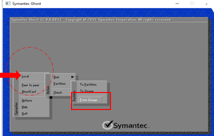 ຄິຣກຂວາ ເປີດຟາຍ Ghost ຂື້ນມາ ໄປທີ່ yes ຈາກນັ້ນມັນຈະປະກົດໜ້າຕ່າງ Symantec Ghost ຂື້ນມາໃຫ້ເຮົາດຳເນີນການຕໍ່ ແລ້ວໄປທີ Local Partition From ImageSymantec Ghost