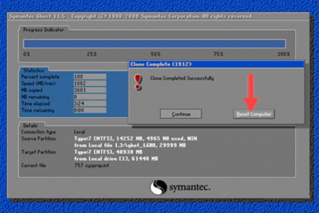 ມາຮອດຂັ້ນຕອນສຸດທ້າຍ ລະບົບກໍ່ຈະແຈ້ງເຕືອນໃຫ້ເຮົາວ່າລະບົບໄດ້ທຳການຕິດຕັ້ງສຳເລັດ ຈາກກໍ່ກົດ Restar Computer ກໍ່ເປັນອັນວ່າສຳເລັດການຕິດຕັ້ງ Windows ໂດຍການນຳໃຊ້ File Ghost
