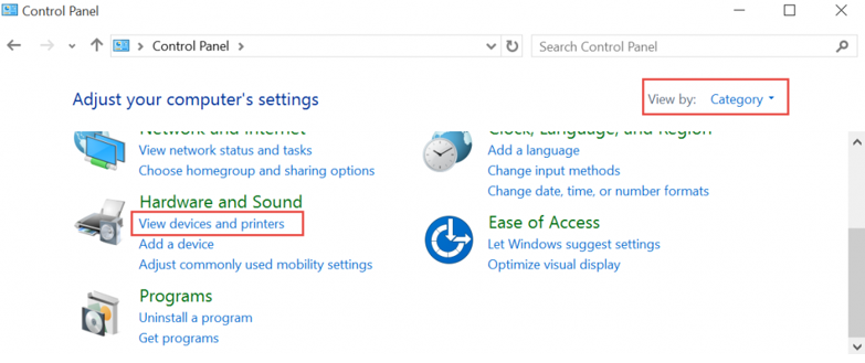 ເລືອກ View by: Category ແລະເລືອກ View devices and printers.