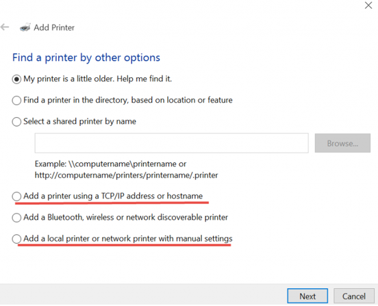 ສໍາລັບ Printer ທີ່ເປັນສາຍ LAN: ໃຫ້ເລືອກ add a printer using TCP/IP.