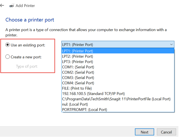 ສໍາລັບ Printer USB: ໃຫ້ເລືອກ Use an existing port: ເລືອກ USB01 ຫຼື USB02.