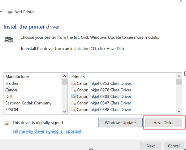 ຖ້າບໍ່ມີ, ໃຫ້ກົດຄລິກ Have Disk ແລ້ວທໍາການ Browse ຫາໄຟລ໌ Drivers Printer ໂດຍທໍາການ Browse ຫາໄຟລ໌ .ini ໃນ Folders ຂອງ Drivers Printer ຂອງພວກເຮົາ.