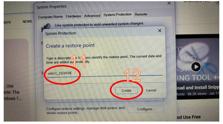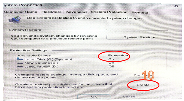 10 ຄຣິກເລືອກ Create ເພື່ອສ້າງ ຈຸດ restore