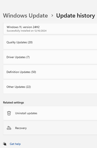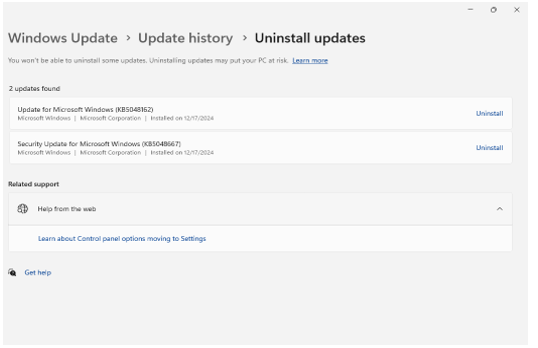 - > Update history > Uninstall updates