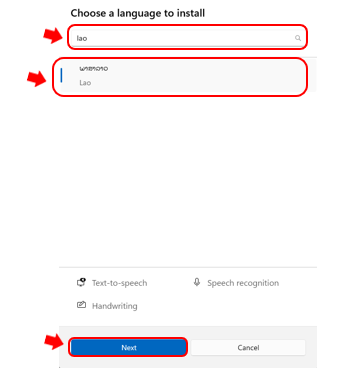 ຈາກນັ້ນ ພິມ “ Lao ”ໃສ່ບ່ອນຄົ້ນຫາ ແລ້ວກົດເລືອກ “ພາສາລາວ” ຈາກນັ້ນກົດ Next