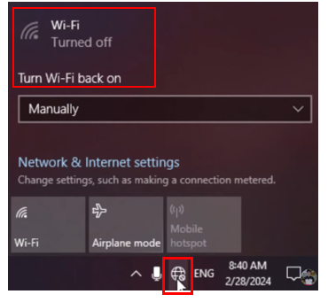 ສຳລັບຜູ້ໃຊ້ງານ Wifi ໃນການເຊື່ອມຕໍ່ອິນເຕີເນັດອາດຈະເປັນ Notebook ຫຼື ໃຊ້ງານ PC ທີ່ມີ Wifi ແບບ USB ຫຼື ອື່ນໆ ເພື່ອເຊື່ອມຕໍ່ອິນເຕີເນັດແລ້ວມີບັນຫາບໍ່ສາມາດໃຊ້ງານອິນເຕີເນັດໄດ້ຂຶ້ນຂໍ້ຄວາມ Wi-Fi Turned off ແລະມີຂໍ້ຄວາມບອກລາຍລະອຽດ Trun Wi-Fi back on ມີໃຫ້ເລືອກປະມານ Manually in 1 hour, in 4 hours ແລະ in 1 Day ເກີດຄຳຖາມວ່າເກີດຫຍັງຂຶ້ນ ແລະ ຖ້າຂຶ້ນລັກສະນະດັ່ງກ່າວຈະຕ້ອງແກ້ໄຂແບບໃດ