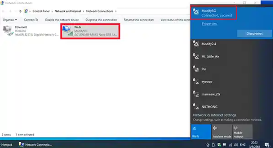 ຫາກ Wifi ຂຶ້ນຂໍ້ຄວາມດັ່ງກ່າວວ່າສະແດງວ່າ Wifi ຂອງເຮົາປິດການໃຊ້ງານຢູ່ສັງເກດທີ່ “View Network Connections” ໂດຍການພິມທີ່ຊ່ອງຄົ້ນຫາ ຫຼື ກົດປຸ່ມ Windows + S ພິມ View Network Connections ຈະໄດ້ແບບພາບດ້ານລຸ່ມ