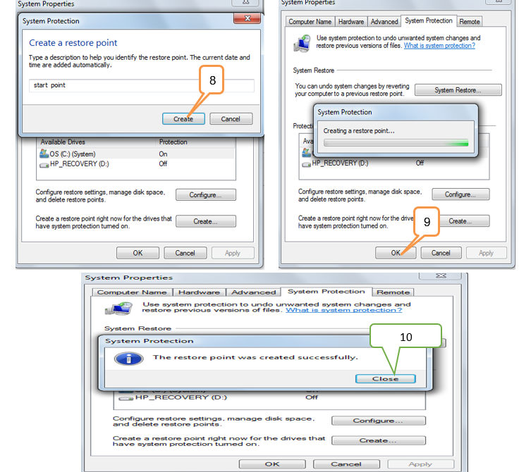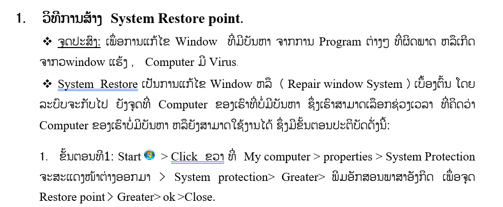 ສຳລັບ System Restore ດັ່ງທີ່ກ່າວໄວ້ຂ້າງເທິງນັ້ນ ເຮົາສາມາດ Restore point ໄດ້ເອງເພາະເຮົາບໍ່າອາດໜັ້ນໃຈ ໄດ້ວ່າ Computer ຂອງເຮົາຈະມີບັນ ຫາເມື່ອໃດ ສະນັ້ນຄວນບັນທຶກຊ່ວງເວລາ ທີ່ເຄື່ອງ Computer ຂອງເຮົາຈະຢູ່ໃນຊ່ວງປອດໄຟ ໄວ້ກ່ອນ ເມື່ອ Computer ມີບັນຫາ ກໍ່ສາມາດ ກັບໄປຍັງຈຸດທີ່ເຮົາບັນທຶກໄວ້ໄດ້ ໂດຍ ວິທີການສ້າງ System restore point.
