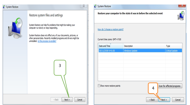 ຂະບວນການ System Restore ເປັນການ Repair ລະບົບໃຫ້ກັບໄປຍັງຈຸດທີ່ຕ້ອງການ (ຈຸດທີ່ບໍ່ມີບັນຫາ ) ສະເພາະ File ຂອງລະບົບເທົ່ານັ້ນບໍ່ກ່ຽວກັບໄຟທີ່ເຮົາສ້າງຂື້ນມາເອງ ຕົວຢ່າງວຽກເອກະສານຕ່າງ ຂອງເຮົາທີ່ເຮັດຂື້ນມາບໍ່ມີຜົນກະທົບໃດໆກັບເອກະສານ.