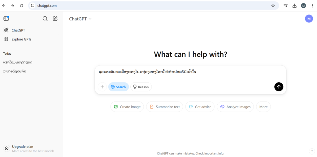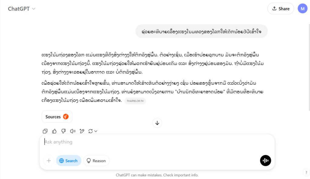 ກ. ໃຊ້ Chatgpt ອະທິບາຍເລື້ອງຍາກໆ ໃຫ້ເປັນເລື້ອງງາຍໆ ເຊັ່ນ ພິມຄຳວ່າ ຊ່ວຍອະທິບາຍເລື້ອງແຮງໂນມຖ່ວງຂອງໂລກໃຫ້ເດັກນ້ອຍ3ປີເຂົ້າໃຈ