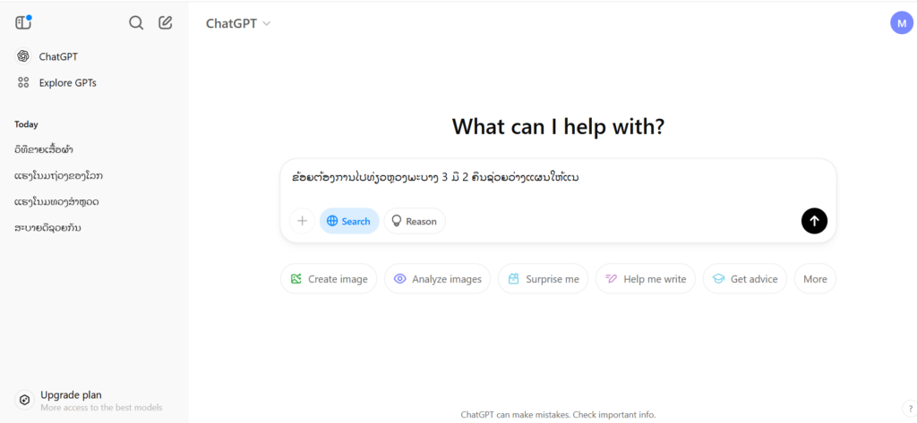 ຂ. ໃຊ້ Chatgpt ວາງແຜນເລື້ອງຕ່າງໆເຊັ່ນ : ຂ້ອຍຕ້ອງການໄປທ່ຽວຫຼວງພະບາງ 3 ມື 2 ຄືນຊ່ວຍວ່າງແຜນໃຫ້ແນ
