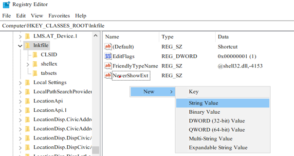2. ກົດ >HKEY_CLASSES_ROOT > lnkfile ຫຼື ກົດ LN ທີ່ແປ້ນພິມ ລົບ IsShortcut ອອກ