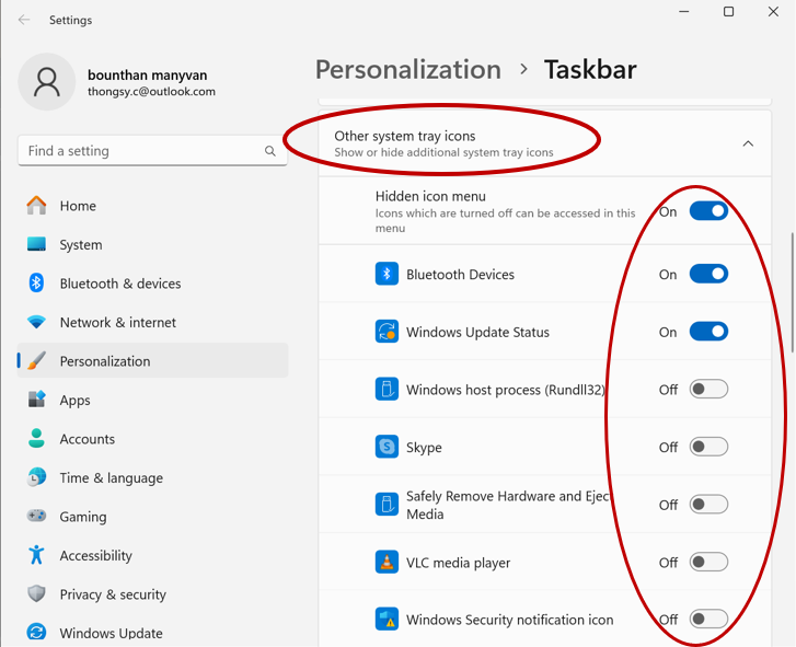 2. ກົດເລືອກທີ່ System tray icon ແລ້ວກໍານົດການເພີ່ມ ຫຼື ລົບ Icon ໂປຣແກຣມ ທີ່ຕ້ອງການ ໂດຍການກົດປ່ຽນທີ່ On ແລະ Off