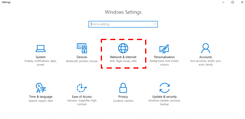 ຂັ້ນຕອນທີ່ 1 ຄຣິກທີ່ Start > ເລືອກ Settings ຈາກນັ້ນເລືອກທີ່ຫົວຂໍ້ Network & Internet
