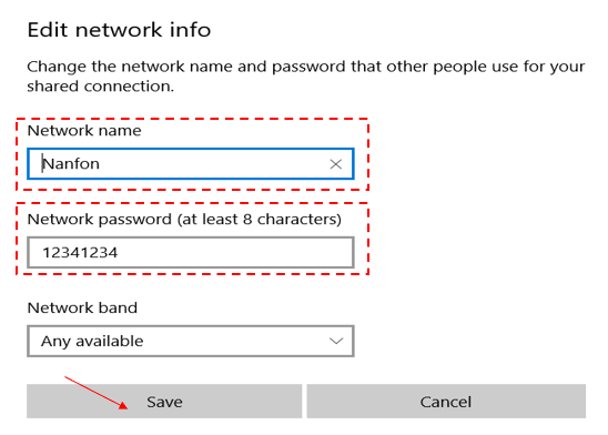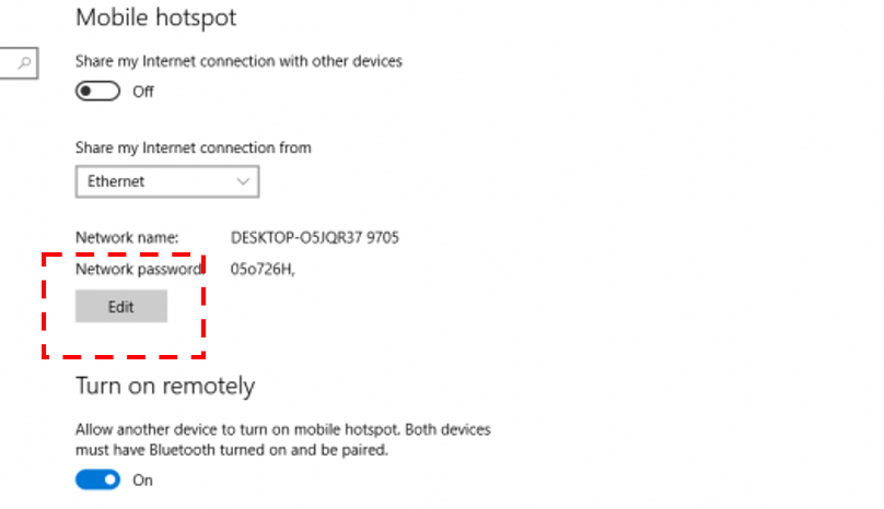 ຂັ້ນທີ່ 2 ເລືອກຫົວຂໍ້ Mobile hotspot (ຄຣິກທີ່ Edit ເພື່ອແກ້ໄຂຊື່ ແລະ ລະຫັດເຊື່ອມຕໍ່)