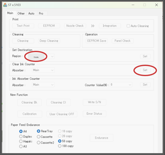 5. ທີ່ Clear link counter ໃຫ້ເລືອກ Set (ດ້ານຂົວມື) ແລ້ວລໍຖ້າໂປຣແກຣມປະມວນຜົນຈົນກ່ວາເຄື່ອງພິມຈະພິມທົດລອງ 1 ໃບ ຈາກນັ້ນກົດປຸ່ມ OK