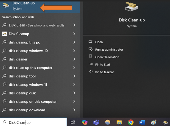3. ໃຫ້ໄປທີ່ Start > ເລືອກຊ່ອງຄົ້ນຫາ > ພິມ >Disk Cleanup ເລືອກ Disk Clean up ກົດ Enter ເພື່ອກໍາຈັດໄຟລ໌ຂີ້ເຫຍື້ອເຫຼົ່ານີ້.