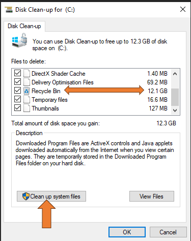 4. ເລືອກກົດໃສ່ບ໋ອກແລ້ວຈະຂື້ນເຄື່ອງໝາຍຕິກເອົາ Recycle Bin ຈະເຫັນໄຟລ໌ຂີ້ເຫຍື້ອ ໃຫ້ກົດ Clean up system files