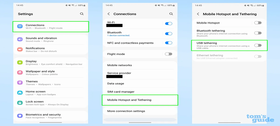 ໃນອຸປະກອນໂທລະສັບມືຖື Android ຂອງທ່ານ, ເຂົ້າໄປທີ່ແອັບ Settings ແລະຊອກຫາຕົວເລືອກທີ່ມີຊື່ວ່າ USB tethering.ໃຫ້ໄປຊອກຫາເມນູທີ່ມີຊື່ວ່າ Network and Internet ຫຼື Connections. ແລ້ວເຮົາຈະເຫັນການເຊື່ອມຕໍ່ USB ພາຍໃນການຕັ້ງຄ່າ USB ທີ່ປາກົດຂຶ້ນເມື່ອທ່ານສຽບໃສ່ໂທລະສັບຂອງທ່ານ.